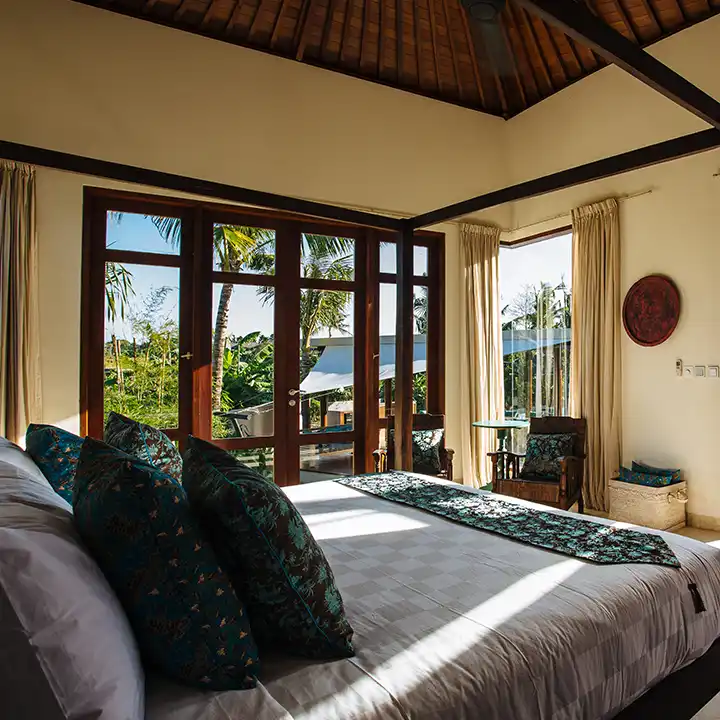 Designed by Balinese architect Komang Suardika, the villa’s signature bowed rooftops, and flowing pavilions embrace the natural curve of the land. With its elegant blend of stone, wood, and water, Umah Daun invites you to rest, reconnect, and return to presence.
